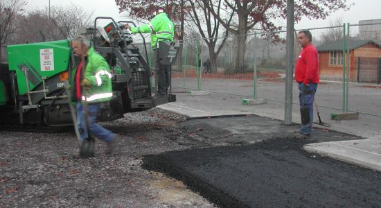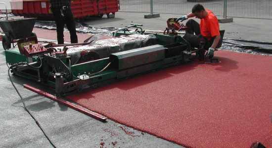 Die vorhandene Asphaltfläche war so schadhaft, dass der erwünschte weiche Belag nicht ohne weitere Baumaßnahmen aufgebracht werden konnte.